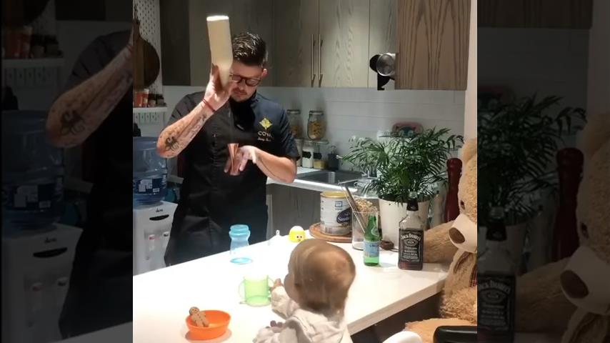 Sany Bacsi, Ein professioneller Barkeeper, der in Dubai arbeitet, bereitet Milch für seinen kleinen Sohn vor.