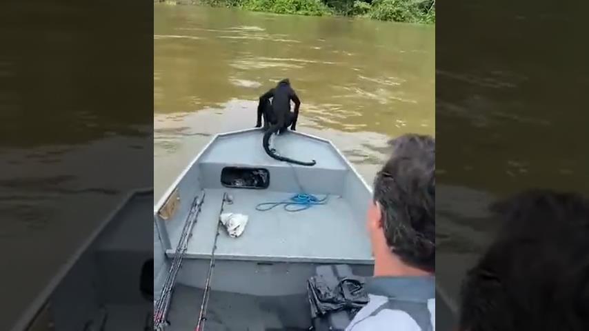 In Brasilien< ένας μακάκος εντοπίζεται από δύο ψαράδες να κολυμπάει μέσα σε ένα ποτάμι. Ο μακάκος θα πηδήξει πάνω στη βάρκα, περιμένοντας να φτάσει μέχρι την όχθη.