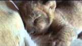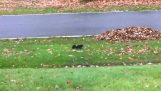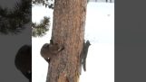 Ein Mann gibt einem dehydrierten Eichhörnchen, das er auf der Straße getroffen hat, etwas Wasser, und gewinnt sein Vertrauen.
