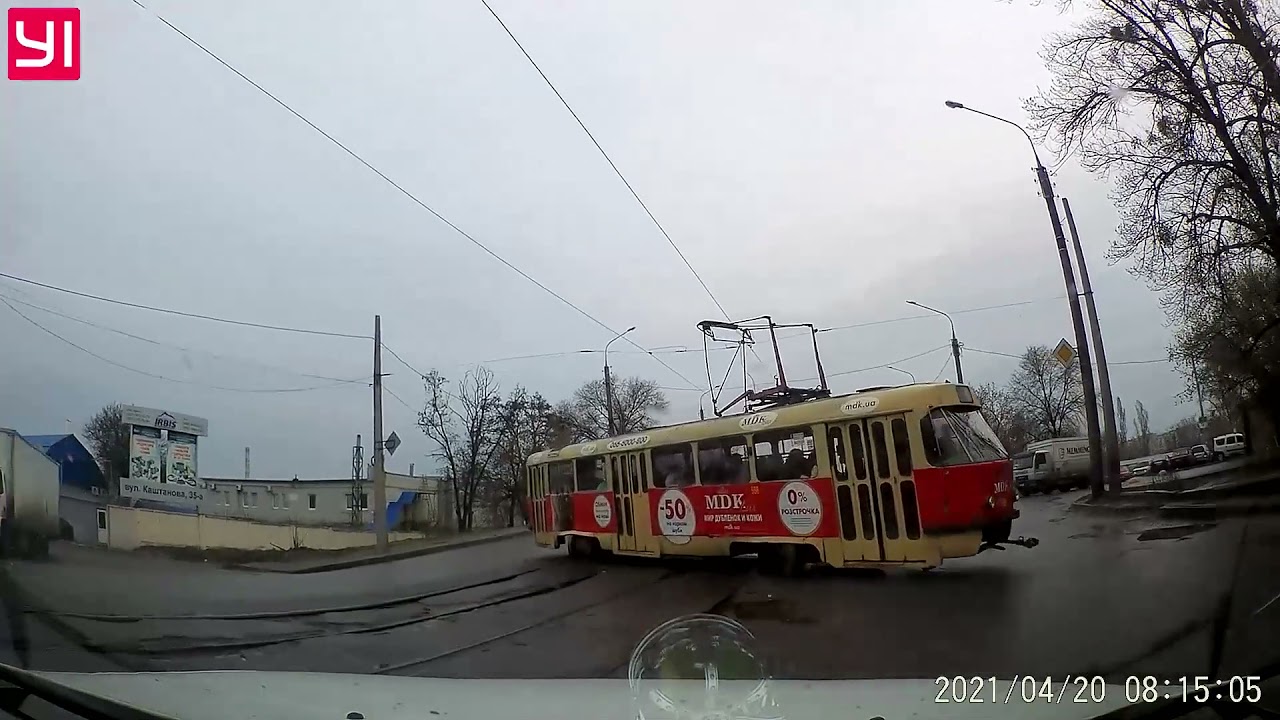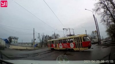 In Charkiw, Ukraine, Eine Straßenbahn entgleist auf einer Abfahrt, und geht außer Kontrolle auf ein Auto zu. Der Fahrer wird rechtzeitig reagieren, und wird sich sofort von der Stelle entfernen, um den Unfall zu vermeiden.