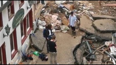 In Deutschland, in Bad Münstereifel, eine ortsansässige gefilmte Reporterin / RTL-Journalistin Susana Ohlen bedeckt ihr Gesicht mit Schlamm vor einem Dreh.