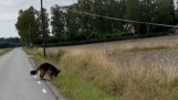 Die Krähe Gosha hilft einem Handwerker, indem sie ihm einen Schraubenschlüssel bringt, in einem Garten in Lysva, Russland.