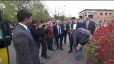 Ein Lieferbote wird von einer freundlichen tibetischen Dogge erschreckt.