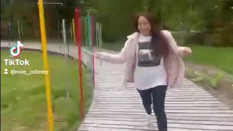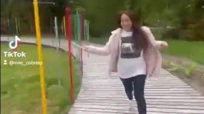 In der Stadt Cuenca, Ecuador, Eine Frau rennt und schlägt mit einem Stock in der Hand auf Metallstangen. Die Notenzeilen spielen abwechselnd jeweils eine separate Note, damit alle zusammen das Stück 'Ode an die Freude' von Ludwig van Beethoven komponieren.