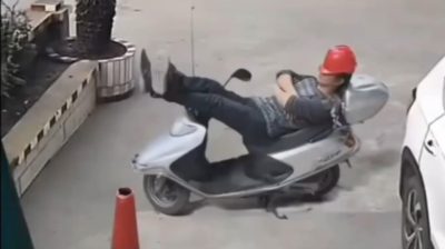Als er sorglos auf seinem Roller schläft, Ein Mann wird von einem Geräusch neben ihm überrascht sein.