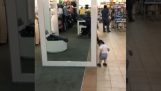 Eine Katze versucht, eine andere Katze daran zu hindern, auf einen Spiegel zu springen.