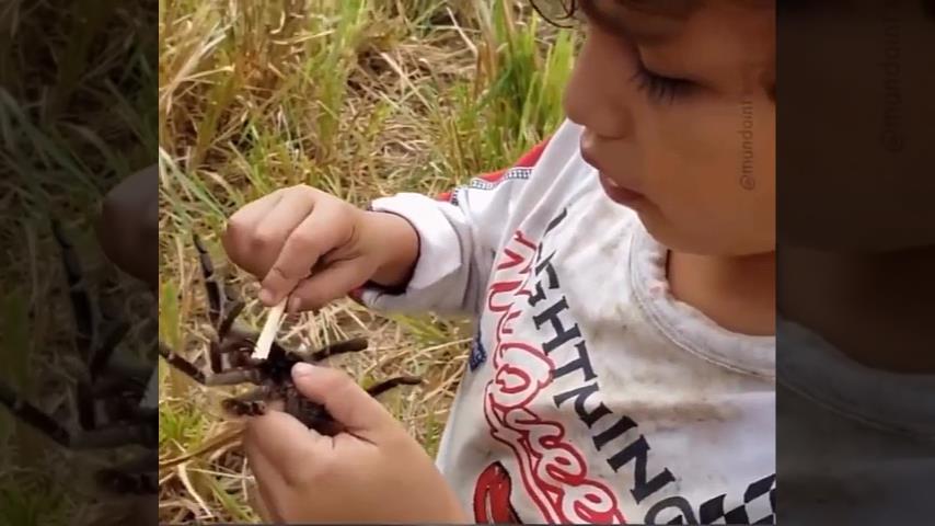 Ohne eine Spur von Angst, Ein kleiner Junge fängt eine Vogelspinne und zeigt uns, wie groß ihre Zähne sind.