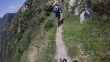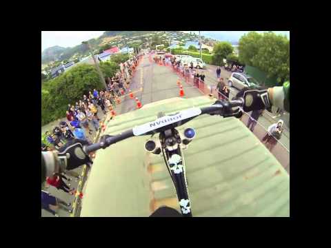Schöne Aufnahmen von einer Kamera auf seiner Brust Radfahrer Nick Jordan, während des Lyttelton Urban Downhill-Rennens in Neuseeland