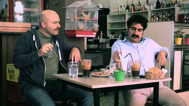 Lustige Zitat aus dem Theater 'eine der Ziegen' mit Antonis Krompa und John Drakopoylo.