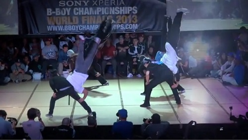 Finale des Breakdance-Wettbewerbs „BBoy Championships 2013“ in Birmingham, England, und zu sehen, den spektakulären Showdown zwischen Gruppen Floorriorz (Japan) und morgen der Eule (Korea). Die beiden Finalisten begeistern das Publikum mit ihren Tanzbewegungen.