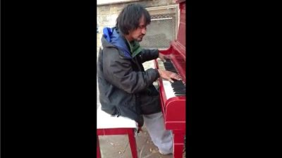Die Ryan, ein Obdachloser, der 30 Jahre auf der Straße lebt, im freigegebenen Klavier von Churchill Square eine eigene Rolle zu spielen, in Edmonton, Kanada. Die Ryan hat noch nie Klavierunterricht getan und ist Autodidakt.