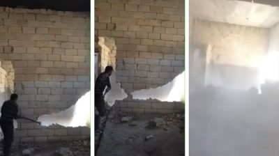 Ein Mann versucht, eine Wand mit einem Vorschlaghammer zu zerstören, aber es hat sich verschätzt, die schwere. Das Ende ist ziemlich viel erwartet..