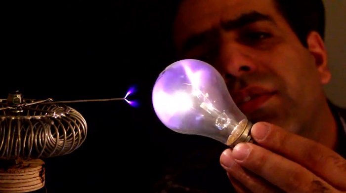 Der Elektroniker Meddy Santandar zeigt uns die „Magie“, die jemand mit einer Tesla-Spule machen kann. Leuchtet eine Lampe aus der Ferne, erstellt einen einfachen Motor mit Draht und spielt Musik mit Elektronen.