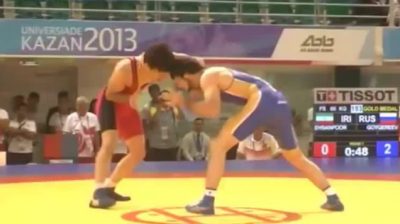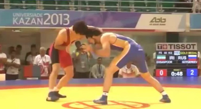 Der russische Ringer Bekkhan Goygereyev machte eine spektakuläre Bewegung gegen seine Gegner, Ende der römischen / Freistilringen Wettbewerbe der Universiade 2013.