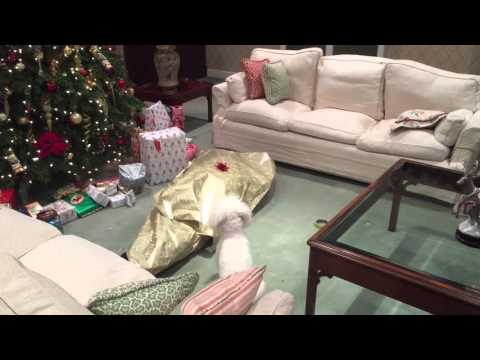 Dieser Hund, Ärger, haben eine besondere Überraschung am Weihnachtsmorgen als es ein Geschenk unter dem Baum für ihn war. Er war überglücklich zu finden sei unter dem Geschenkpapier seiner Lieblings-Menschen, Startseite für Weihnachten.