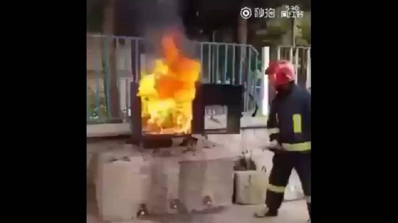 Ein Feuerwehrmann in China macht uns zu einer Feuerlösch Demonstration, mit einer Flasche Coca-Cola als Feuerlöscher.