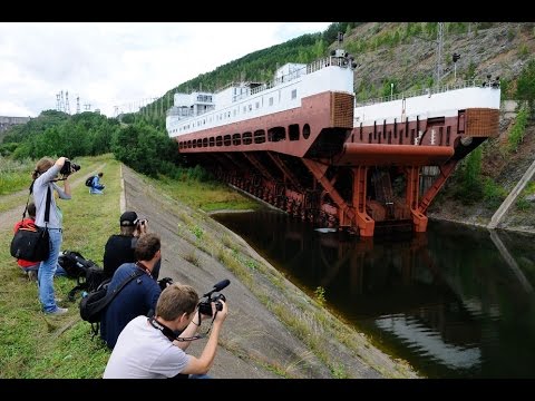 Dieses Schiffshebewerk befindet sich auf dem Krasnojarsker HPP. Das ist ein riesiges Bad auf den Schienen, es ruft zuerst auf einer Seite des Damms unterhalb des Wasserspiegels an, ist mit Wasser gefüllt, und drinnen schwimmt das Schiff, das Tor ist geschlossen und das Schiffshebewerk fährt nach oben, wo es eine 180-Grad-Kurve gibt und auf der anderen Seite des Damms absteigt, wo das Tor geöffnet wird und das Schiff ausschwimmt. Gewicht ohne Wasser von 4000 Tonnen Wasser und das Schiff von 8000 Tonnen, die Geschwindigkeit von 1,2 km / h. Offiziell, es funktioniert seit 1982. Das Video liefert Einheiten für das Kraftwerk, die sich stromaufwärts des Jenissei . befindet.