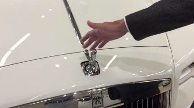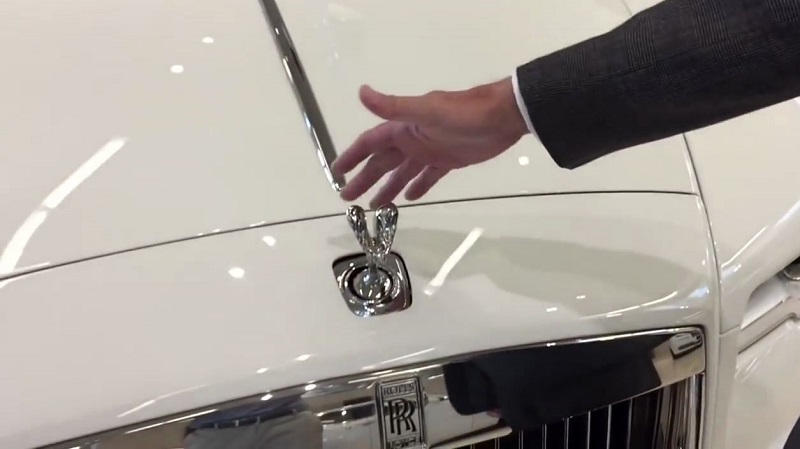 Die Mark Powell, Sales Manager für den Rolls-Royce in Tampa Bay, demonstriert das Diebstahlschutzsystem, das seit 2004 in den Autos der berühmten Marke eingebaut ist, um den „Spirit of Ecstasy“ zu schützen., die kleine Statue auf der Motorhaube liegend.