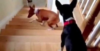 Aus unerfindlichen Gründen, Dieser Hund klettert die Treppe des Hauses auf den Kopf.