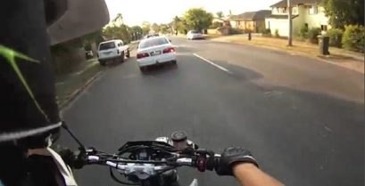 Motorradfahrer in Brisbane, Australien, akzeptiert, von einem Fahrer, der von hinten mit großer Geschwindigkeit kommt überfahren. Dann landet auf dem Dach des Auto-proporeyomenoy.