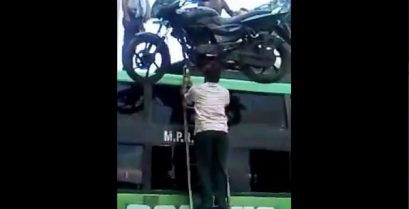 In Indien, ein Mann lädt ein Motorrad auf dem Dach eines Busses, auf seinen Kopf halten, wie er eine Leiter klettert.