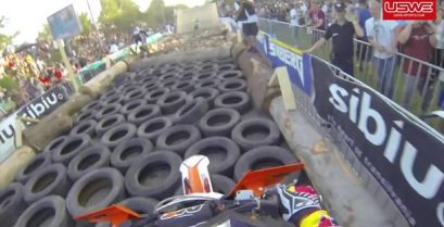 Der Enduro-Meister, John Walker, zeichnet die Versuchsstrecke in Romaniacs Rennen 2013 in Sibiu Rumänien. Teilnehmer müssen durch sehr schwierige Hindernisse wie Baumstämme, Reifen und große Steine.