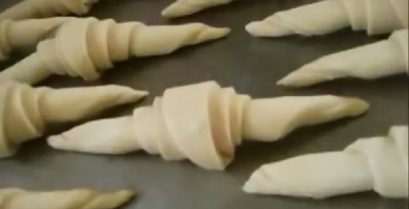 Die Vincent Talleu Baker macht handgemachte Croissant in seiner Werkstatt.