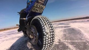 Der Ingenieur Peter Petrov aus der Woronesch-Russland, Er baute improvisierte Motorradreifen mit Nieten und macht uns zu eine Demonstration in zugefrorenen See.