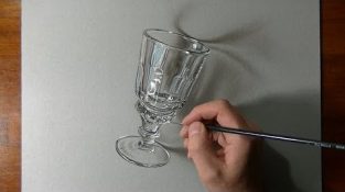 Wie zeichnet man ein Absinthglas mit gemischten Medien – hyperrealistisches Schnellzeichnen, Mischtechnik auf grauem Papier von Marcello Barenghi – Italienische Kunst.