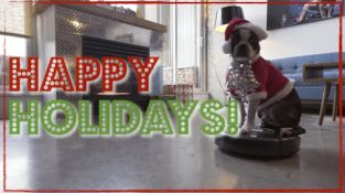 Happy Holidays von fünf der Boston Terrier aka Santa Dog auf einem Roomba.