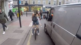 Die Szene von einem Motorradfahrer fand auf der Straße A5204 London gedreht wurde. Der Fahrer eines LKW näherte sich eine Frau auf einem Fahrrad an einer Ampel warten. Er begann gefährlich ihr Handy anrufen nähern [...]
