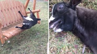 Die Ricky, eine Zwergziege, Springen im Garten auf einer Schaukel. Der Ricky leidet myotonia, ein Zustand, der seine Muskeln nach intensiver Erregung „blockiert“.. vollständig kokkalomenos, , Ricky fällt mit [...]