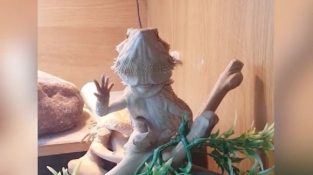 Jemand grüßt eine Eidechse Pogona in einem terrario liegend. Nach einer Weile, Die Eidechse nähern sich und wird zu seinem Besitzer reagieren, macht eine Geste mit dem rechten vorderen Fuß.
