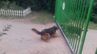 Ein Kampf bricht aus vier mutige Hunde bellen, durch ein elektrisches Tor getrennt…