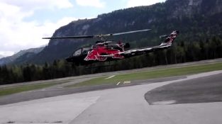 Am Flughafen Hoefen Österreich, Redbull ein Helikopter landet in der Nähe der Vorderseite eines Gebäudes und der Propeller mit den Metallwänden der kollidierende. Zum Glück, Niemand wurde verletzt.