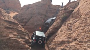 Fahrer in einem Jeep Cherokee schafft eine sehr steile Klippe im Park Sand Hollow zu klettern, in Utah der Vereinigten Staaten.