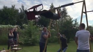 Ein Mann in Russland geht auf einer Schaukel und mehrere Umdrehungen machen, wenn es plötzlich losgeht ...