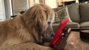 Ein Golden Retriever Uhren ein Eichhörnchen Video auf einem Tablet