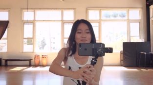 Die Tänzerin Karen Cheng versucht, den Stabilisator Feiyu G4 Plus-Kamera für iPhone, vor einem Spiegel.