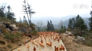 In der Provinz Guizhou in China, ein Bauer lädt Hunderte von Hühnern auf das Futter eine Pfeife mit. Die Hühner kommen von allen Seiten, fliegen und laufen.
