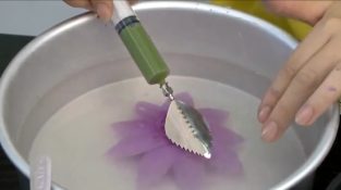 Mit speziellen Tools, Maßzeichnungen von Blumen in Geleebonbons gelegt.