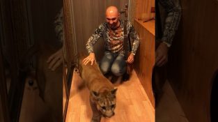 In einem Haus in Russland, Eine große „Katze“ begrüßt fröhlich ihren Besitzer, der nach der Arbeit das Haus betritt.
