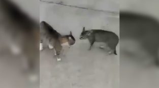 Ein Mann in der Türkei verwendet eine lustige Methode zwei Katzen zu trennen, die sich streiten.