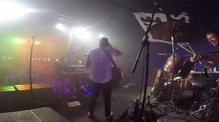 Gitarrist Trips und fällt in Drumkit