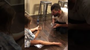 Ein Vater macht einen Witz zu seiner Tochter von etwas Wasser auf dem Boden gießt. Das Mädchen muss dann mit einer Gabel auf Papas Hand schlagen, bevor er das Wasser wegwischt …