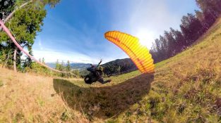 Ausgestattet mit einer GoPro Kamera Fusion auf die Rückseite befestigt mit einer Stange, Österreicher Daniel Kofler macht Geschwindigkeits-Fliegen in der Provinz Bozen in Italien. Der spektakuläre Fallschirm auf den Berg mit großen herab [...]