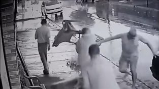 Ein Mann riskiert versucht, das Bier während einer großen Schlägerei zu erholen.