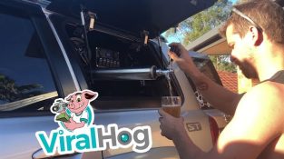 1. Oktober, 2018 / Kleine Höhen, New South Wales, AustralienHomebrew-Bierzapfhahn, den ich in meinem 4WD installiert habe, mit einem 9LT Fass in meinem Kühlschrank in dem Rücken.
