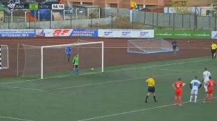 Russisch Norik Avdalyan, 22 Jahren der zweiten Gruppe von Rubin Kasan, eine Strafe durch reverse Purzelbaum gegen FC Ural durchgeführt. Ein schönes akrobatisches Tor, Torhüter Statue links!