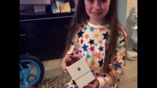 Dad gibt Tochter ein Nokia in einer iPhone X-Box